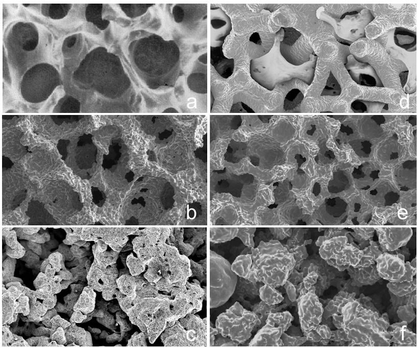 The industrial process is virtually the same for all these ultra-porous components, namely the creation of a trabecular structure with metal deposited on the surface. Polyurethane foam, reticulated bioglass or another organic substance can provide a trabecular framework for the metal coating applied using either a plasma spray (sintering, or high temperature bonding) or an electrochemical process (low temperature arc vapour deposition). (Fig. 6)