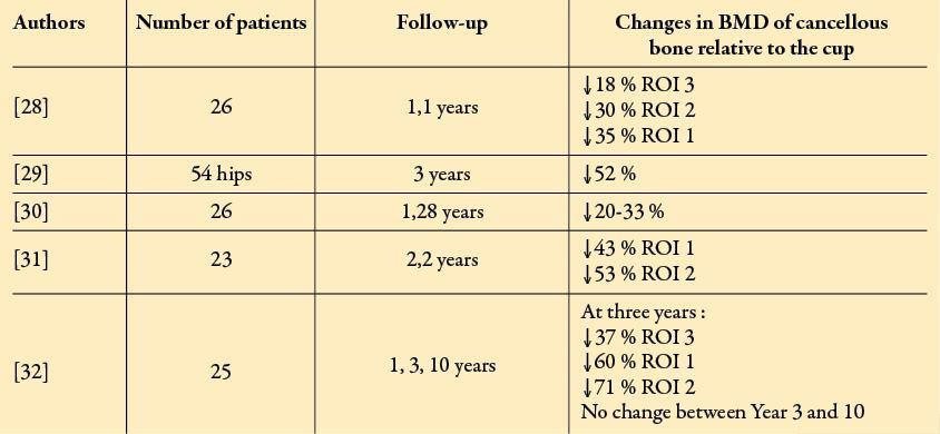 It remains unclear whether bone remodelling after THA in patients with reduced BMD differs from the results obtained by these authors. But given that bone loss can range from 20 to 60% in the first three years (see Table 1), the risk of post-THA complications increases in case of reduced BMD in this zone.