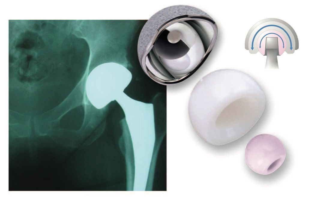 In turn, the large PE liner ball articulates with a highly polished metallic acetabular shell. The PE large head diameter is usually 6–8mm smaller than the outer metallic shell. There are two distinct articulations: a small articulation between the head and the PE liner and a large articulation between the PE head and the acetabular shell. Most of the movement occurs at the small articulation. Movement of the large articulation only happens when the stem’s neck comes into contact with the PE head. Wear can occur at three interfaces: the small and large bearing and at the neck–polyethylene contact area (third articulation).