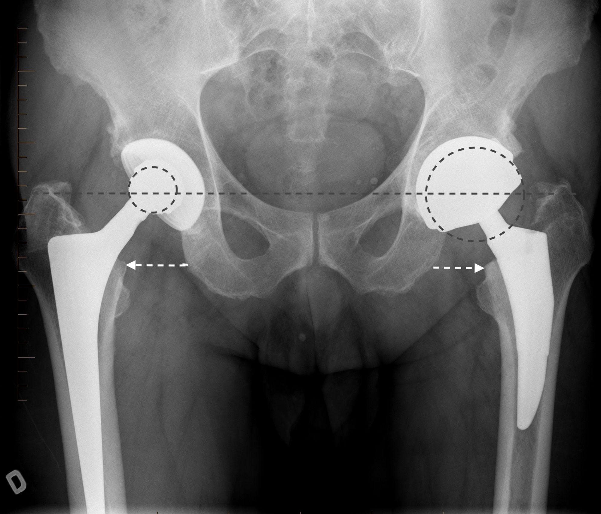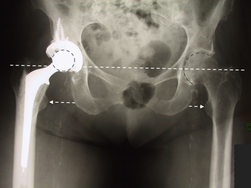 Precise biomechanical reconstruction of the hip is essential for the success of this procedure. Better clinical function and abductor strength can be achieved from optimal femoral offset and restoration of leg length. Otherwise, failure to restore the normal anatomy during THA has been associated with a higher rate of dislocation, muscle weakness, limping, leg-length discrepancy, impingement, and early loosening of the implant (Fig. 4).