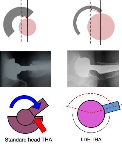 Key Points: LDH THA, defined by femoral heads exceeding 36 mm, increases jump distance and the head-to-neck ratio, significantly reducing dislocation risk and providing supraphysiological ROM. This configuration compensates for surgical imprecision and variations in spinopelvic mobility. Clinical evidence supports the use of CoC LDH for patients with a life expectancy over 20 years due to superior wear resistance and reduced osteolysis. Conversely, DM LDH is indicated for older or higher-risk populations. LDH bearings also enhance micro-stability via increased suction forces. Implementation of ERAS protocols has been shown to reduce postoperative complications by 50% and facilitate outpatient surgery by decreasing hospital length of stay. While CoC bearings may produce audible noise, it is generally benign and does not correlate with decreased functional scores. Trunnionosis risks are mitigated through the use of ceramic femoral heads.
