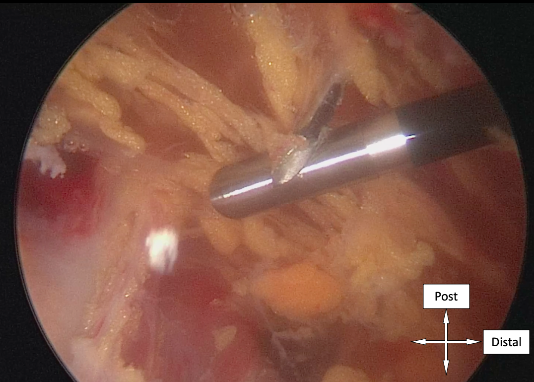 Once the nerve can be seen, dissection should be gradual. Release any obvious fibrovascular bands (Fig. 11), then release laterally, posteriorly, anteriorly and finally medially in order to dissect the branch of the posterior cutaneous nerve of thigh (Fig. 12).