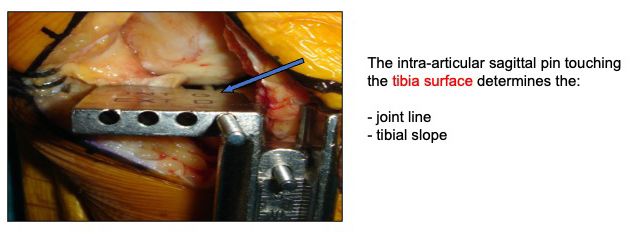 In the sagittal plane, the tibial slope of the implant should be cut to replicate the preoperative native slope of the lateral plateau. The slope should be sufficient to allow good flexion, but not too much to cause anterior translation of tibia which could result in an ACL tear due to excessive strain. Knees with excessive or less natural lateral slope (5 to 7° with cartilage) will need a compromise tibia cut which then has to be compensated at the posterior femur cut to balance the lateral flexion gap. Using an intra-articular sagittal pin in line with the tibial plateau, is a simple and effective way of controlling the joint line height and slope when making the cut (Fig. 10).