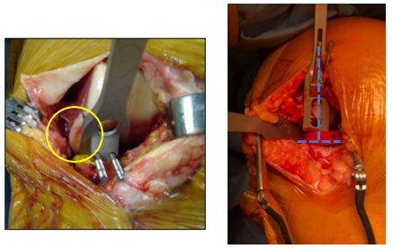 The joint line reference for determining the height of the tibial cut will depend on whether the deformity is at the tibia or femur bone. In majority of cases, when the deformity is femoral due to lateral condylar hypoplasia (LDFA < 87° the most common situation for primary lateral tibiofemoral osteoarthritis), the reference point for the tibial cut should be determined in relation to the natural tibia surface. Nevertheless in about 30 % of cases, the valgus deformity are at the tibia bone (MPTA > 90° or bony damage of the lateral tibial plateau), the joint line and reference point for the tibial cut can be determined in relation to the distal lateral condyle.