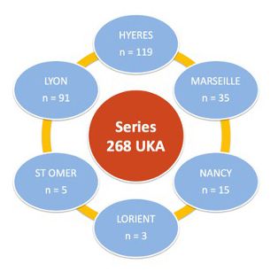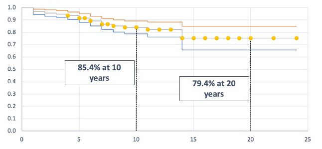 We conducted a retrospective, multi-centre study involving 6 centres in France (Fig. 16). Between 1998 and 2014, 311 lateral UKA were performed in 295 patients (16 bilateral procedures). Twenty-eight patients (28 UKA) died before the end of the 5-year follow-up. Fifteen patients (4.8%) could not be contacted or refused all contact and were classed as lost to follow-up. We therefore analysed the results of 268 lateral UKA in 252 patients, with an average follow-up of 9.1 years (5–23 years). There were 39 surgical revisions (14.6%, Group R1). If we define failure as all-cause surgical revision, the global survival rate for lateral UKA in our series was 85.4% at 10 years and 79.4% at 20 years (Fig. 17). The average time to surgical revision was 5.1 years. Two hundred and twenty-nine implants were still in place without the need for further intervention by the time of last follow-up (Group R0).