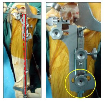 Frontally, the tibia cut should be neutral or tilted slightly into valgus (Fig. 8) to allow the femoral component oriented naturally along the native condylar axis to lie perfectly perpendicular and flat on the tibial surface. The orientation of sagittal tibia cut should be performed in internal rotation (Fig. 9) to avoid any risk of the femoral component impinging with the tibial spines in extension.[22,23] This will need to carefully retract the ligament patella to medial to allow a perfect internal rotated tibia cut.