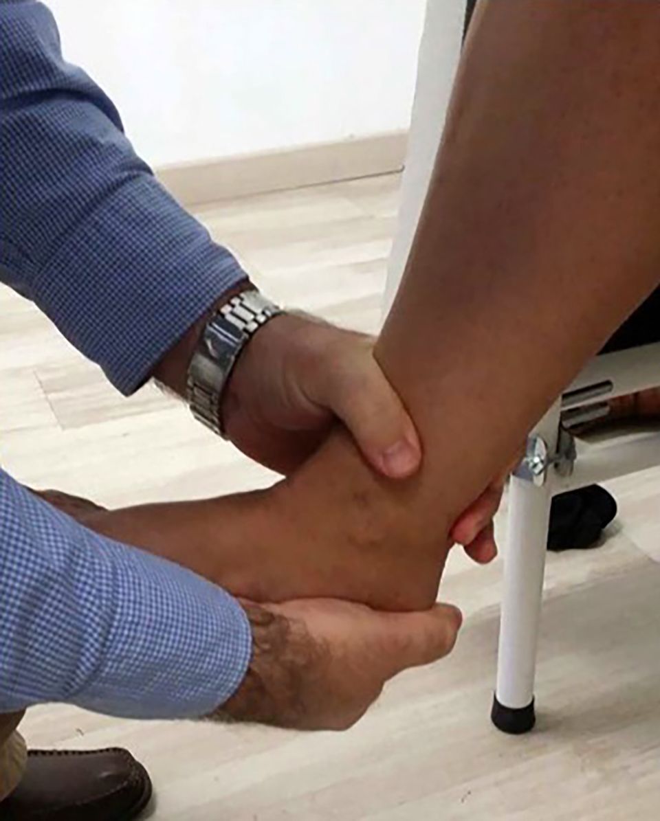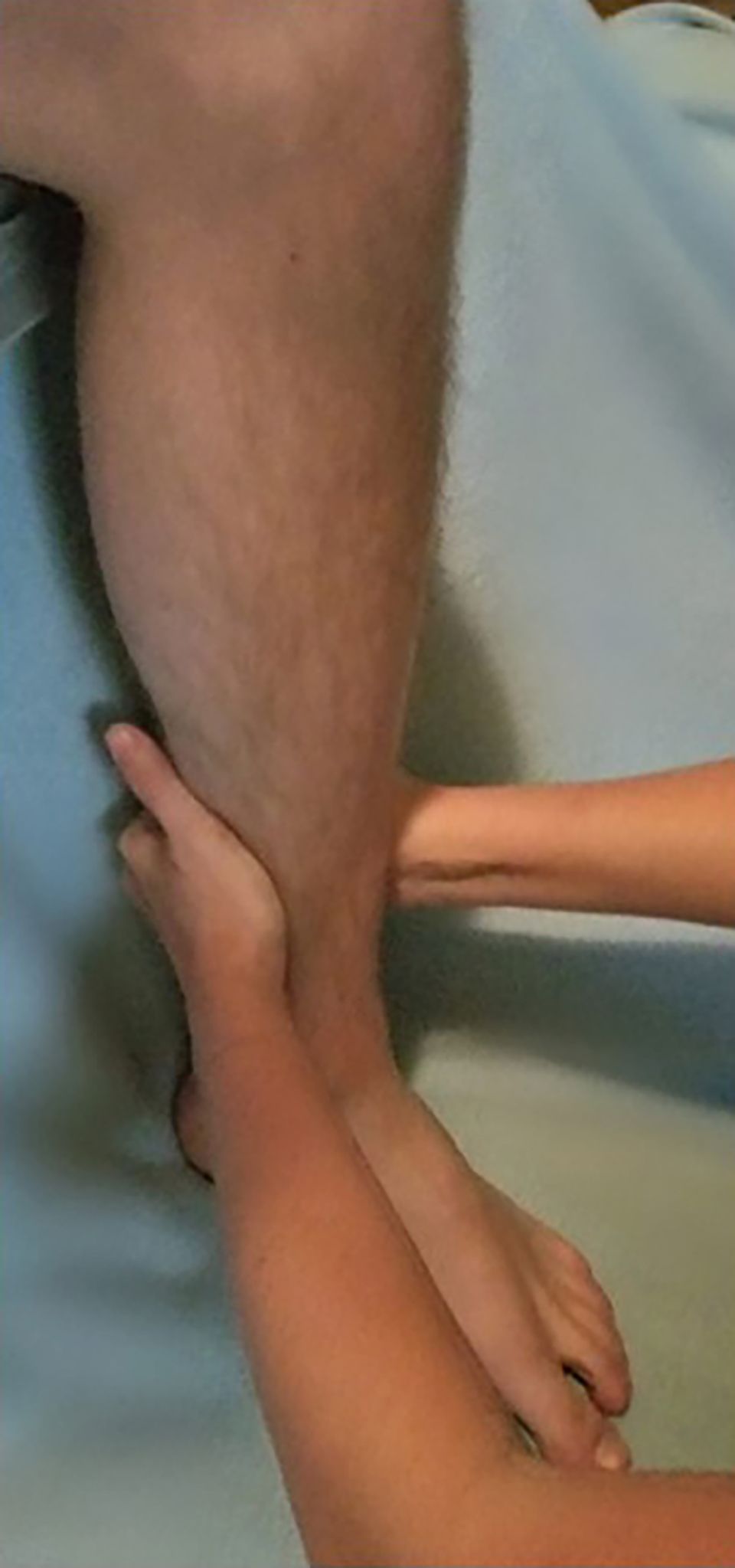 The external rotation stress test consists of stabilization the leg with the knee in 90 degrees of flexion, followed by manual external rotation of the foot. A positive result is when the patient reports pain over de syndesmosis. [17-19]