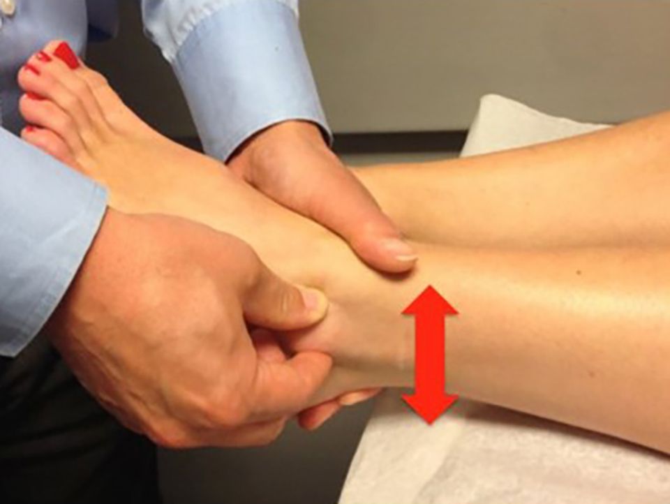 With the fibula translation (drawer) test, the examiner attempts to translate the fibula from anterior to posterior. In the normal ankle, there is a firm end point and little movement. Increased translation relative to the contralateral side and pain indicate a positive test result.