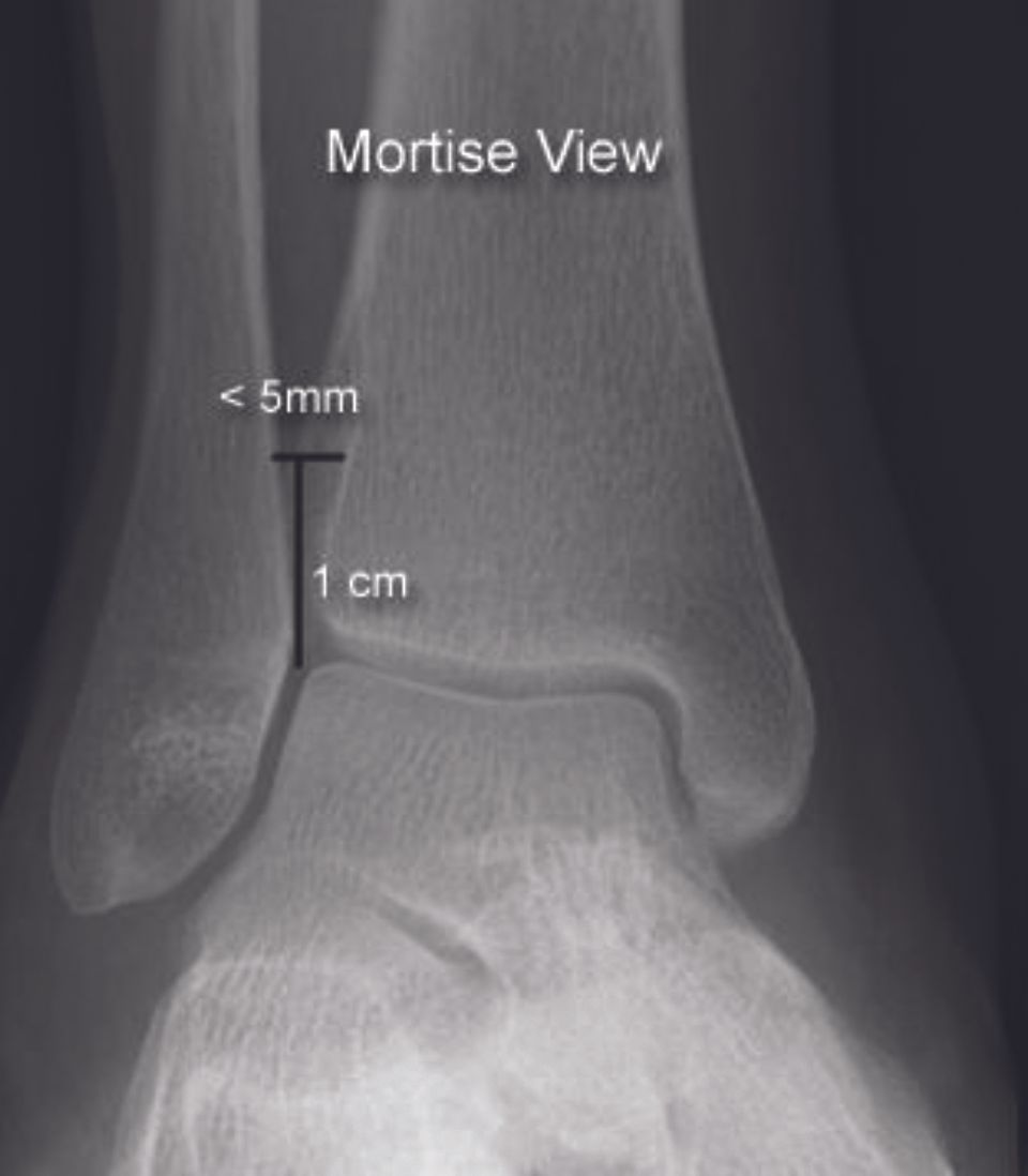 Standard x-rays (AP/mortise and lateral) of the ankle are generally used to rule out malleolar fractures. A useful tool in detecting syndesmotic diastasis may be the evaluation of the space between tibia and fibula, measured on the injured and healthy side. With syndesmotic instability, the clear space widens (diastasis) while the overlap is reduced. Generally, a tibiofibular clear space of less than 6 mm in the mortise view is considered normal [26] In a systematic review looking at accuracy of imaging, the pooled sensitivity for X-ray was 0.53 and the specificity was 0.98 respectively. [27]
