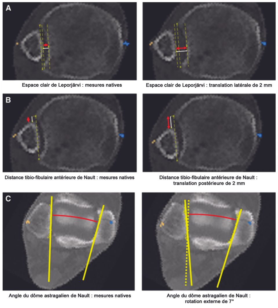 CT scanning is an accurate method of detecting syndesmotic injuries. CT scanning of both ankles allows determination of fibular shift, rotation, shortening and the exact location of bony avulsions. Care is taken to evaluate the fibular rotation and tibiofibular distance in the horizontal plane at exactly the same level as on the uninjured side. Coronal reconstruction allows exact determination of a lateral shift of the talus and measuring of the fibular length. Generally, side-to-side differences of more than 2 mm are considered pathologic. In a recent study the three most responsive CT measurements for detecting isolated syndesmotic malreduction were described. [28] The clear space for lateral translation (Leporjärvi), the anterior tibiofibular distance for posterior translation as well as the talar dome angle for external rotation of the fibula (Nault). In diagnostic meta-analysis, the pooled sensitivity and specificity were 0.67 and 0.87 for CT respectively.[27]