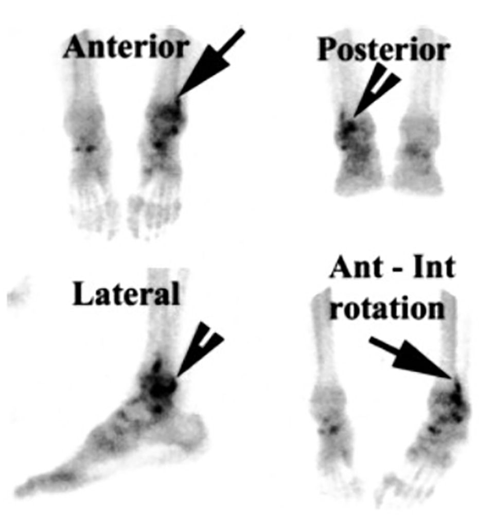 Standard three-phase TC bone scan is a less common used imaging test with low specificity. During the third “bone” phase using high-resolution collimators the anterior, medial, and lateral views of the ankles are used for analysis. In addition, special anterior views with the feet internally rotated by approximately 25° to 35° may be beneficial. One study reported 100% sensitivity, 71% specificity, and 93% accuracy in diagnosing a syndesmotic lesion in the absence of a fracture. [35, 36]