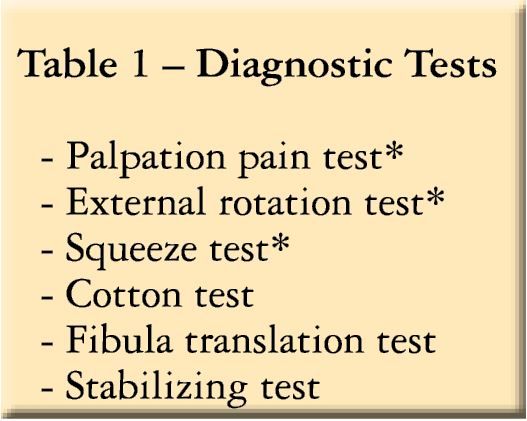 Diagnostic accuracy of several physical tests was reviewed systematically. [23] Two studies [18, 24] investigated diagnostic accuracy. The Cotton test (42.9%), the external rotation test (33.3%), the fibula translation test (61.9%), and the squeeze test (42.9% - 63.3%) all have limitations.