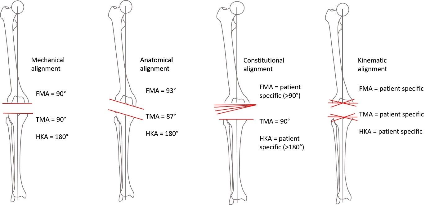 Despite the general acceptance of TKA as the treatment of choice in end stage osteoarthritis, the best method of performing a TKA is still under debate. The optimal implant alignment is only one topic among many others, but it has increasingly gained attention for many knee surgeons (1). Currently there are at least five different alignment concepts promoted, which have led to some confusion among knee surgeons as differences between these concepts are often not understood well enough (2) (Figure 1). Currently there is no evidence that one of these concepts will be more beneficial for the patient with regards to the functional outcome or long-term survival.