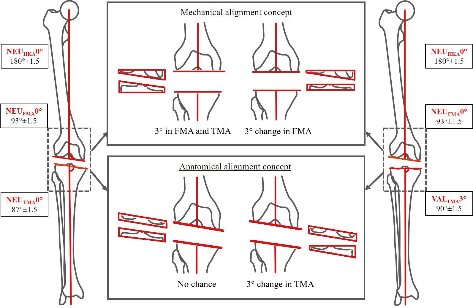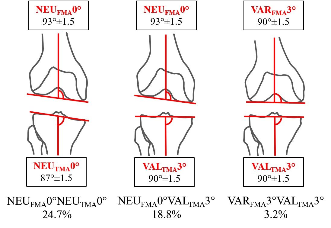 Moreover, if the joint line orientation differs among neutral aligned patients, the impact of different alignment concept might vary significantly. Figure 4 shows the two most common phenotypes and the impact of the two alignment concepts in terms of change in joint line orientation. In the first case with NEUHKA0°NEUFMA0°NEUTMA0° (HKA: 180° ±1.5; FMA: 93° ±1.5; TMA: 87° ±1.5) when mechanical alignment concept is followed the orientation of tibial and femoral joint lines are changed and when performing the anatomical alignment concept, no change is needed for both joint lines. In the second case with NEUHKA0°NEUFMA0°VALTMA3° (HKA: 180° ±1.5; FMA: 93° ±1.5, TMA: 90° ±1.5) both concepts result in a change of 3° but either only in the femur (mechanical alignment concept) or only in the tibia (anatomical alignment concept).