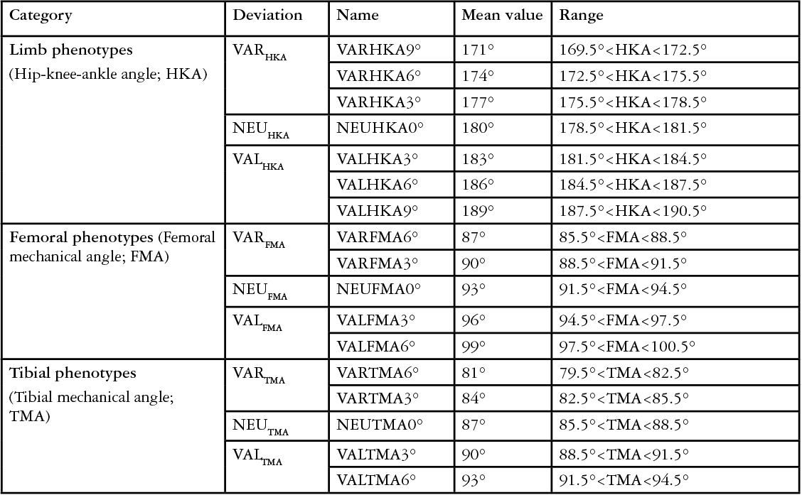 A completely new picture emerges when the KPC is used to analyse the individual alignment based on phenotypes. A phenotype thereby either represents a coronal alignment variation of the femur (femoral phenotype), the tibia (tibial phenotype) or the overall lower limb (limb phenotype). Each alignment variation is based on specific angles (FMA for the femur, TMA for the tibia and HKA for the overall limb) and each phenotype represents a range of ±1.5° from a phenotype specific mean value. The name of phenotypes thereby contains of three parts. Part 1 defines the direction of deviation (NEU, VAR, VAL) from the overall mean value of the angle, part two defines the phenotype specific angle (second subscripted part: HKA, FMA, or TMA) and part 3 the average deviation from the mean values (0°, 3° and 6°) (Fig 3).