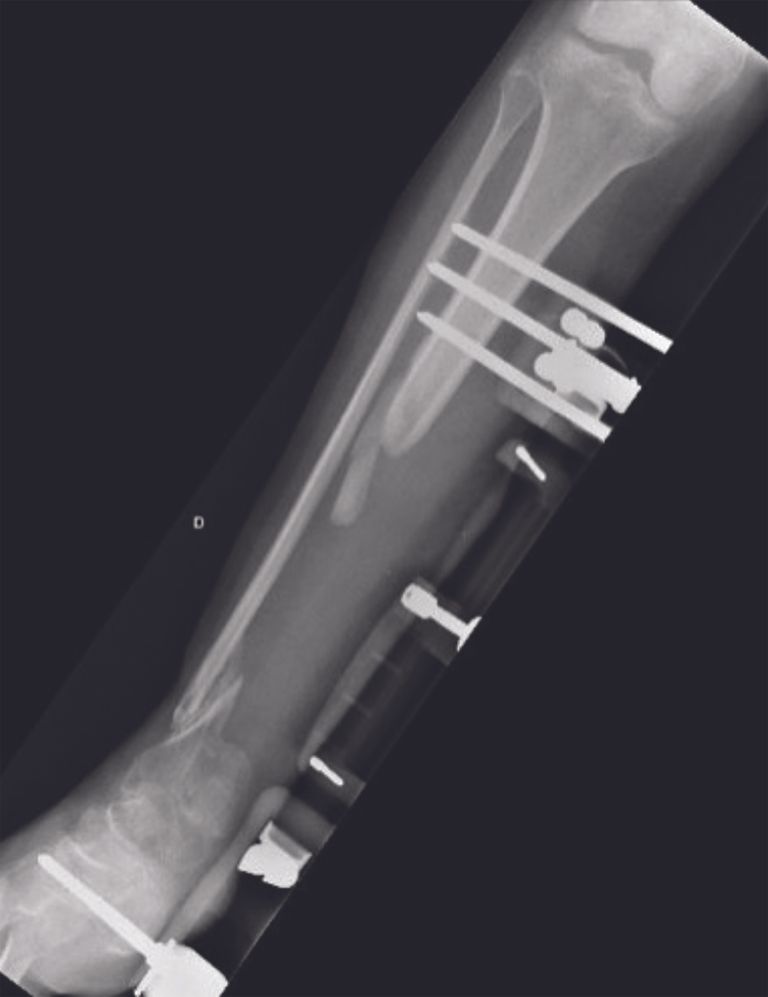 For these reconstruction cases many surgeons prefer the Masquelet technique in this situation. Following emergency care, the first surgical stage consists of bone debridement, inserting an antibiotic bone cement spacer and immobilizing the limb with an external fixator (or performing a temporary osteosynthesis) (Fig 3). Once the fracture location is stabilized, the soft tissue lesions can be managed, by extensive debridement followed by flap coverage, and treating any infection with local and systemic antibiotics. The Masquelet technique builds an induced membrane around the cement spacer within a month.
