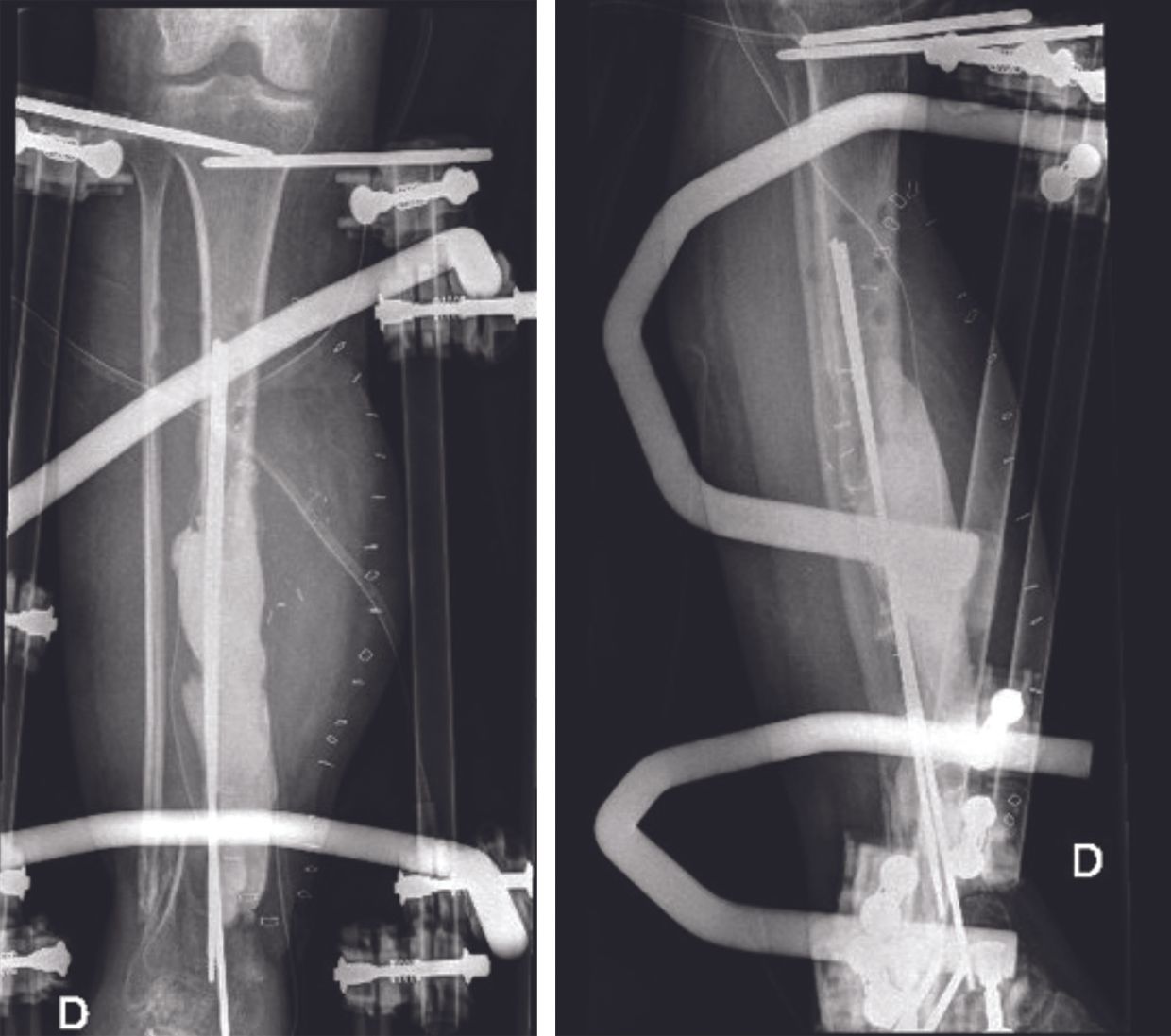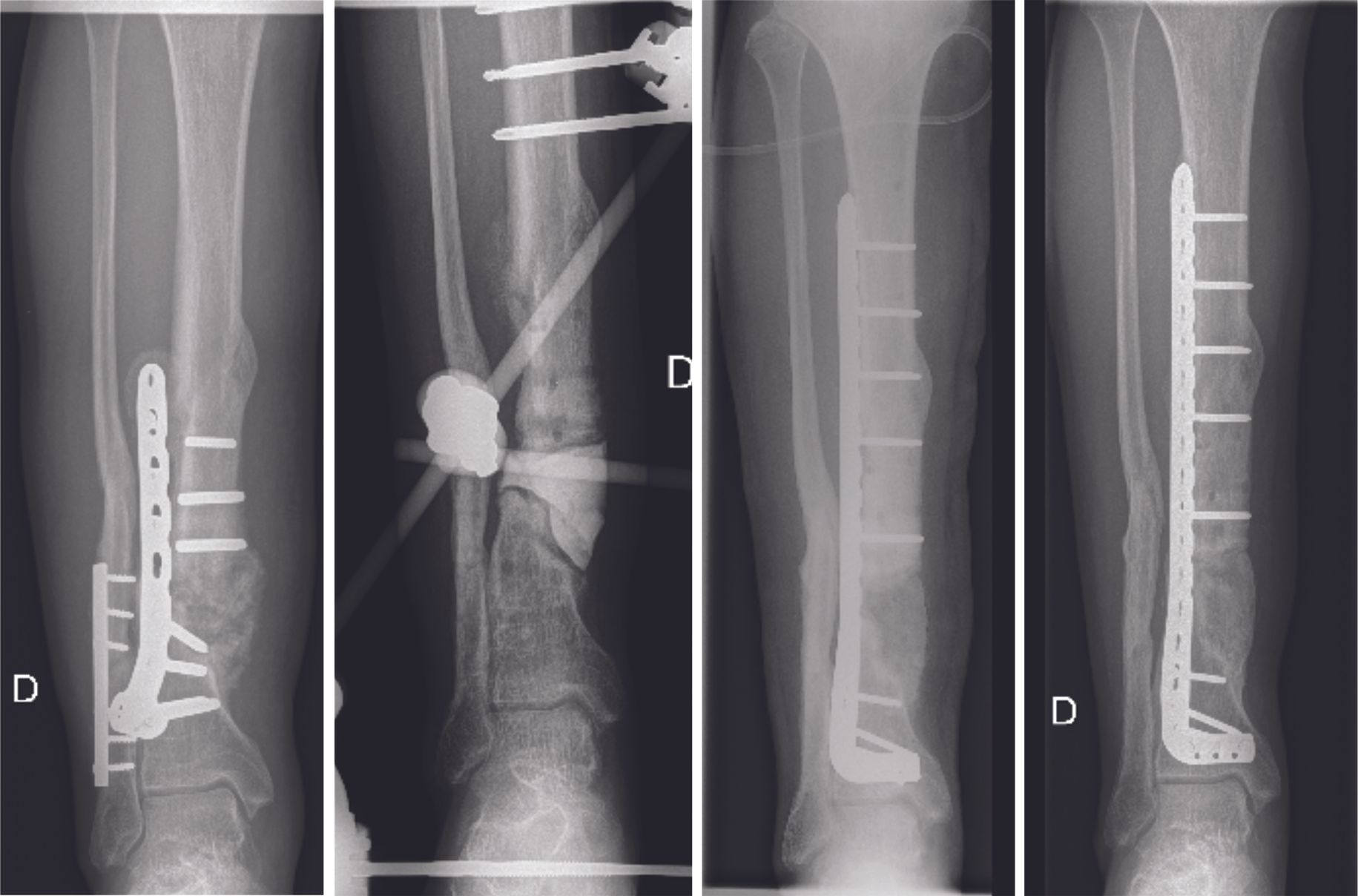 The therapeutic strategy is to perform a resection of the pseudarthrosis until healthy bone is encountered (Fig. 6 A), insert an antibiotic bone cement spacer (Fig. 6 B) and then combine these local antibiotics with intravenous antibiotic therapy. In a second stage, which should be performed at least 6 weeks later, the surgeon replaces the spacer with a bone graft using the Masquelet technique or an intercalary prosthesis (Fig. 6 C). Intravenous antibiotic therapy should continue for several weeks post-surgery, depending on the type of infection.