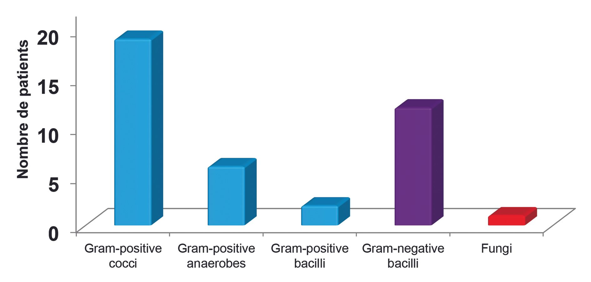 We studied 18 patients treated for septic pseudarthrosis at the Reference Centre for Osteoarticular Infections in Lyon in 2015 and 2016. The results of bacteriological sampling during bone resection revealed a predominance of Gram-positive staphylococci, but also Gram-positive anaerobes, gram-positive bacilli and Gram-negative bacilli. These septic pseudarthroses had been managed in two stages and a gentamicin-impregnated spacer (500 mg of gentamicin in 40 g of cement) was inserted during bone resection. All identified bacteria were gentamicin-sensitive, thus indicating that it should be the local antibiotic therapy of choice. One fungal infection was also identified (Fig. 7).