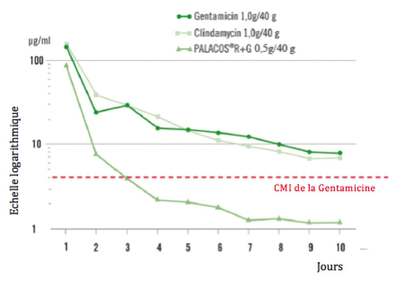In addition to their low toxicity and their efficacy in the treatment of initial infections and the prevention of superinfections, these local antibiotics can also prevent the formation of a biofilm on osteosynthesis or implant material. Ensing5 demonstrated in an in vitro study that the combination of gentamicin and clindamycin inhibits biofilm formation, as opposed to standard cement without antibiotics. In contrast, when cement impregnated with gentamicin alone is used, biofilm formation was similar to that observed on antibiotic-free cement. This characteristic is of great importance when performing osteosynthesis for pseudarthrosis but also for arthroplasty surgery.