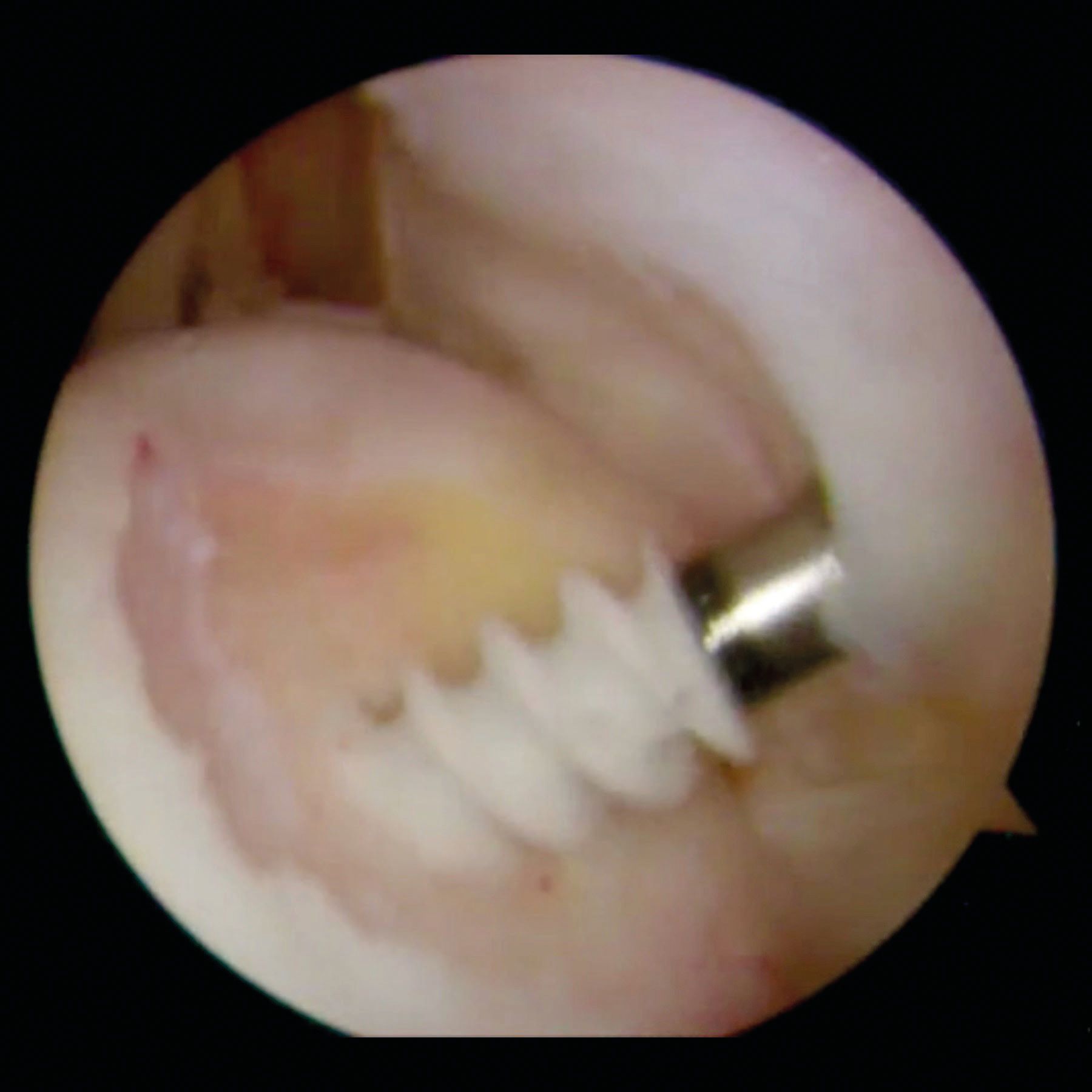 An additional posterior portal can be done to provide access directly to the Hill-Sachs lesion. The use of a spinal needle allows the surgeon to choose the optimal position and the correct transtendon angle before performing the portal in order to optimize the orientation of the anchor and the instruments. The surface of the Hill-Sachs lesion is gently freshened with a bur with care taken to remove the minimum amount of surface bone. In addition, the surface of the entire posterior and inferior capsule is freshened with a shaver blade [24].