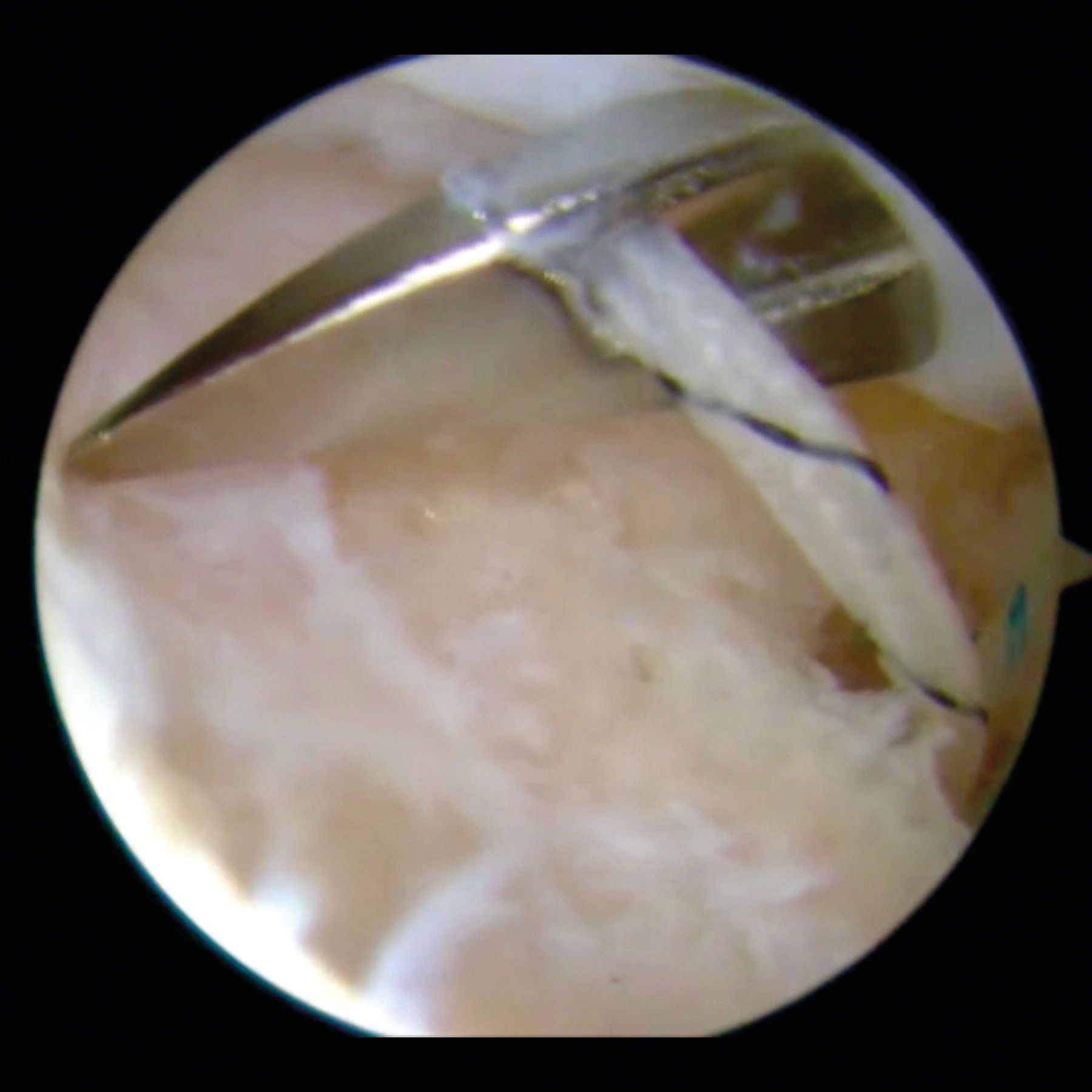 At this point the surgical procedure can be carried out. It is important to cautiously follow the different steps. Usually, the arthroscope is in the anterosuperolateral portal and the procedure can be achieved through the posterior portal. However, the size and the position of the Hill-Sachs vary, making the standardization of the posterior approach difficult.