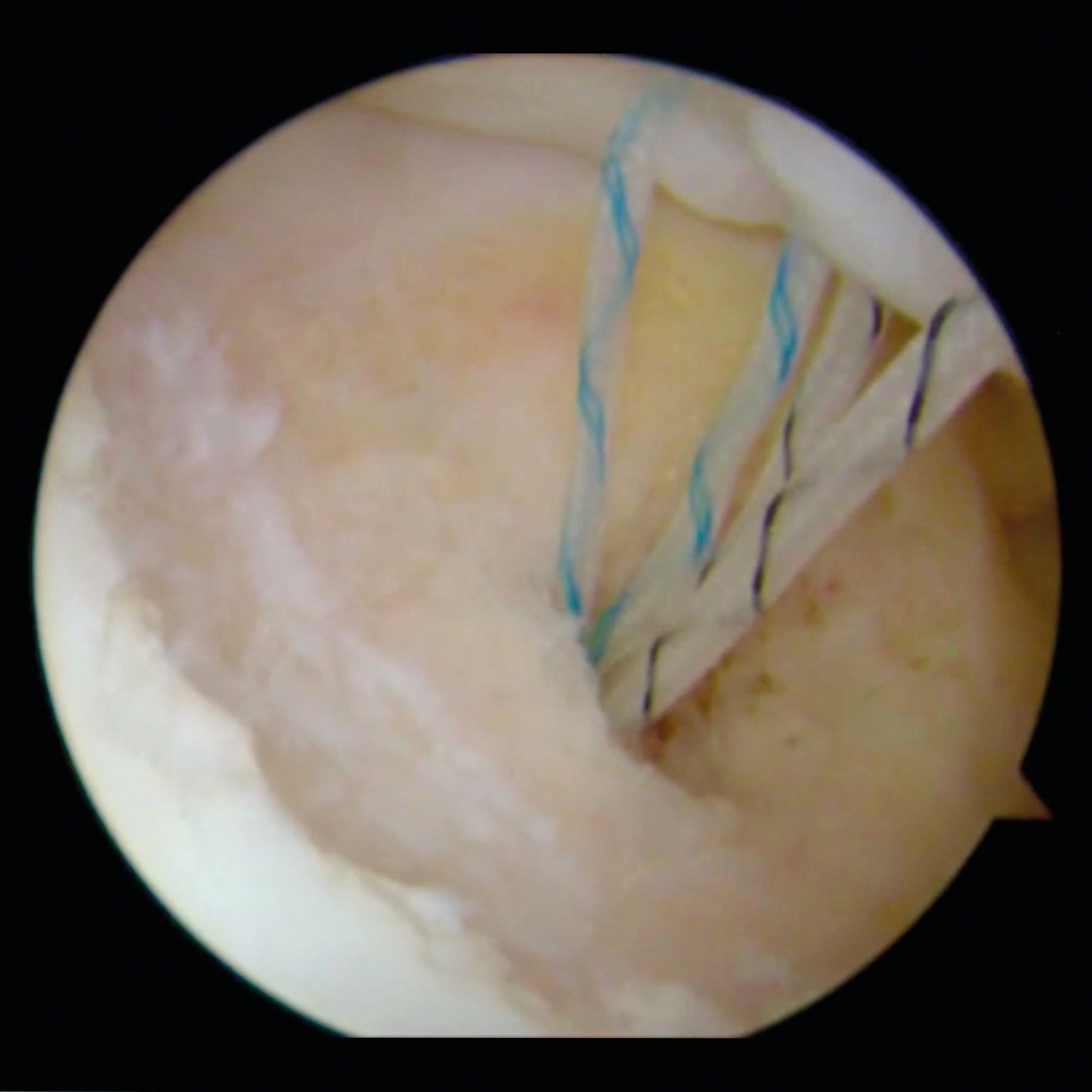 Some surgeons prefer to place the arthroscope in the subacromial space when they tie the sutures over the infraspinatus [25] in order to better control the procedure and a suture bridge can be performed between the two anchors.