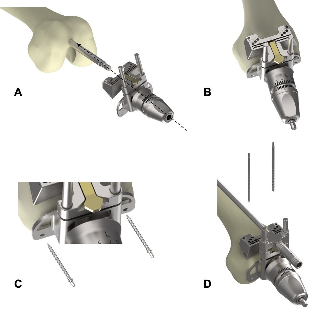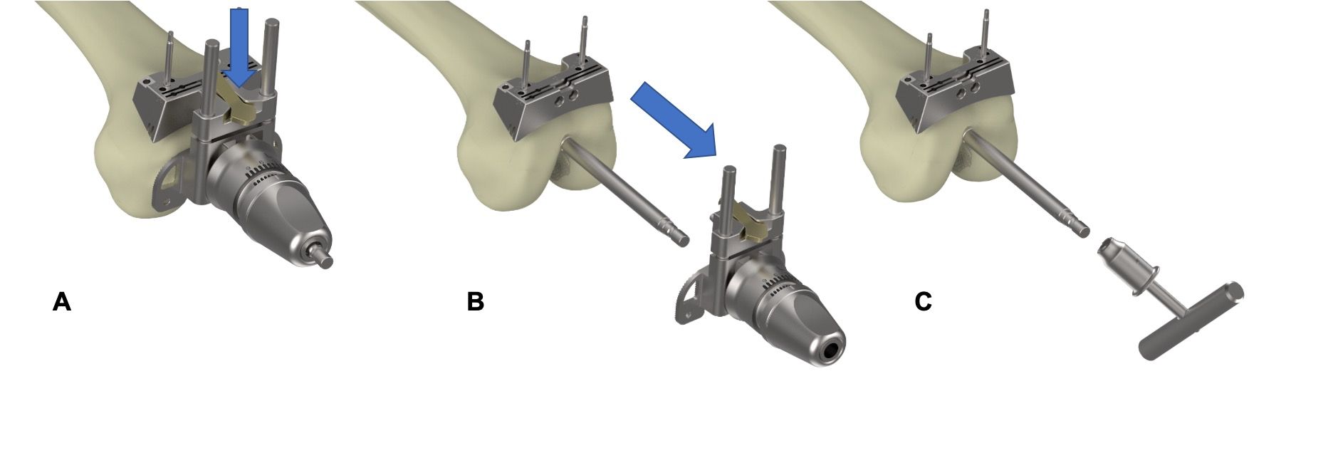 After creating the intramedullary entry point, the intramedullary rod is inserted into the tibial canal up to the score line, using the impactor handle. The guide is then placed over the intramedullary rod, and the pins are impacted into the tibial eminence for proximal fixation (Figure 8C). The guide is stabilized distally using the ankle clamp.
