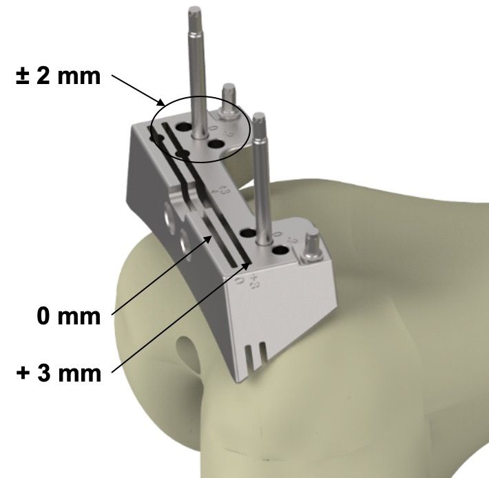 Cut height is assessed using a test plate. Depending on the desired thickness of the distal femoral cut, the instrumentation offers three possibilities: (i) 0 mm cut in the distal slot (for an 8 mm implant); (ii) +3mm cut in the proximal slot (e.g. for flexion contractures); or (iii) the entire guide can be repositioned on the pins, allowing for ± 2mm readjustment (Figure 5). With this system, the cut can be adjusted from -2mm to +5mm. The distal femoral cut is then made after the cutting guide has been secured laterally using two short threaded pins with depth stop.