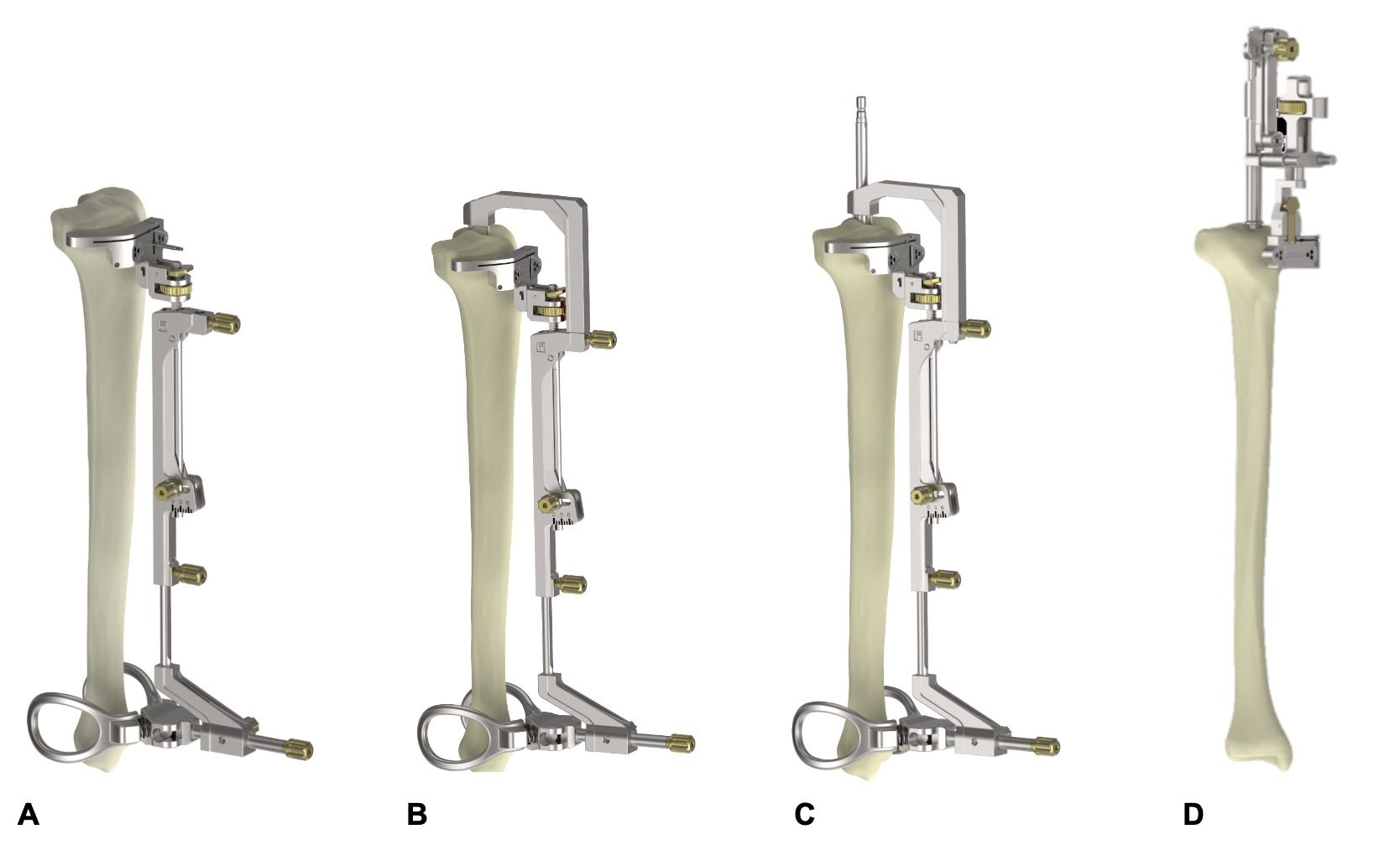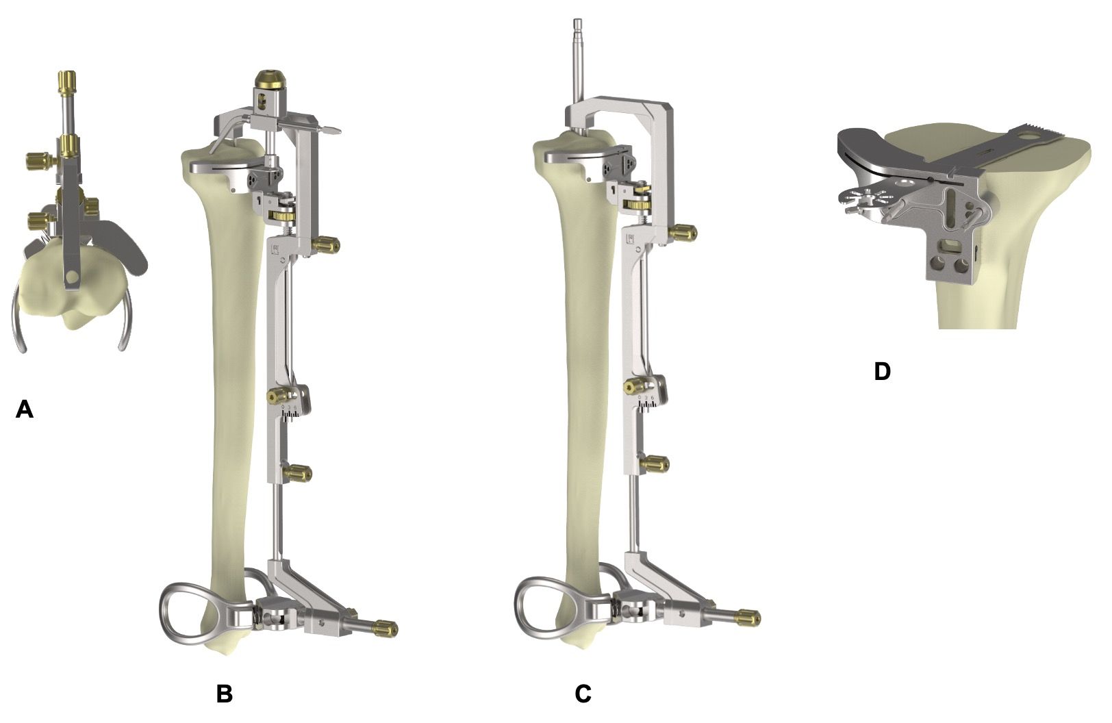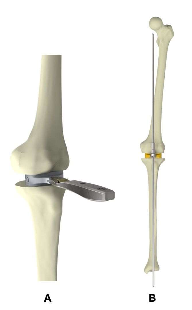 The instrumentation can be configured in four different ways for making the tibial cut: extramedullary, extramedullary supported by the tibial eminence, extramedullary on an intramedullary stem, or intramedullary with extramedullary verification (Figure 6).