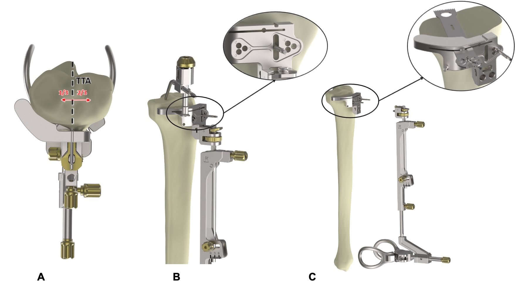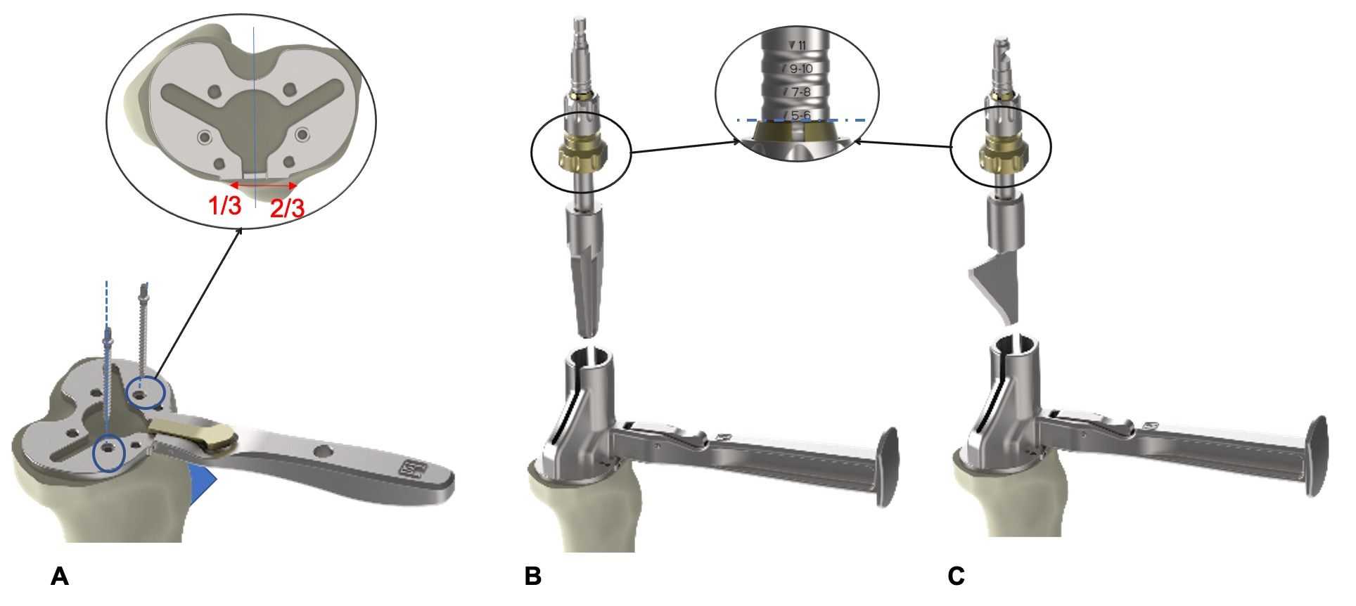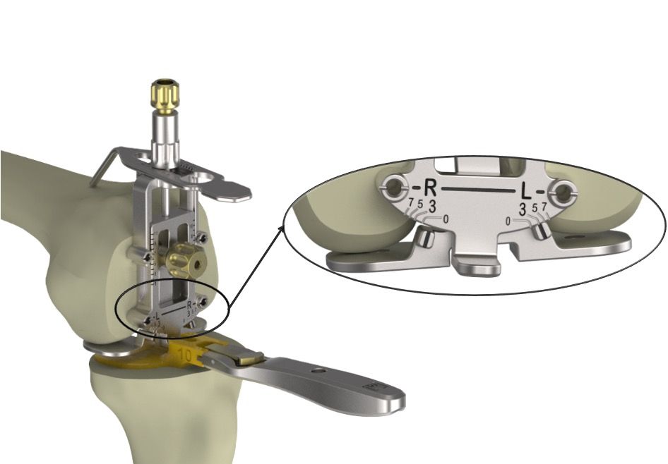 For all four options, the tibial stylus is then inserted into the slot on the guide. Using this system, resection height and tibial slope can be finely adjusted using the dials. The instruments can be easily removed by pressing the release button (Figure 7C, Figure 9B). The tibial resection height can then be adjusted by ±2mm.