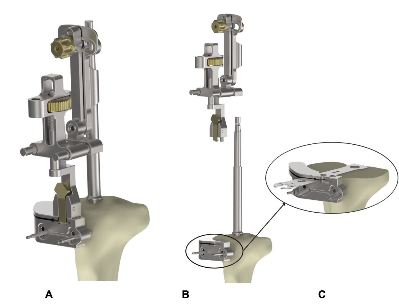 Method 2: Extramedullary configuration supported by the tibial eminence (Figure 6B): Proximally, the pins on the guide are impacted into the tibial eminence, and distally the guide is stabilized using the ankle clamp (Figure 8B).