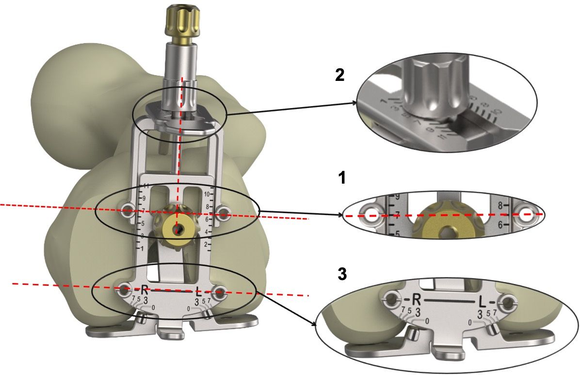 Once the rotation is set, two pins are inserted, either into the upper holes (for an anterior reference point) or the lower holes (for a posterior reference point).