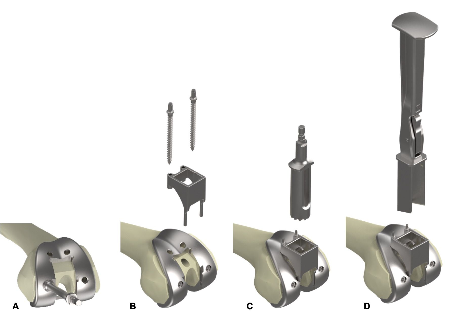 The box cut is made using the trial implant which saves time because the tests can be performed using the trial tibial component. It also makes it quick and easy to assess patellar tracking, knee kinematics and spontaneous tibial rotation during flexion and extension of the knee (Figure 14A). At this stage, the tibia baseplate with the insert without the peg is not fixed to the bone and the femur component can be still placed medially/laterally before preparing the posterior stabilization box. Before removing the trial tibial insert, the two femoral holes are created using a drill bit with a depth stopper (Figure 15). The trial femur is stabilized with screws and the PS box cut can be prepared using a hole saw bit and extractor (Figure 15C& D). After inserting the femur box and the tibia PS peg a new test using the posterior stabilization insert can now be performed (Figure 14B & D).