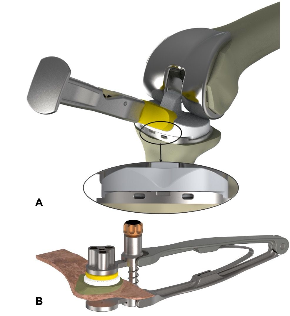 First the tibia followed by femur is finally fixed. The poly tibial insert is slid in horizontally and impacted, ensuring an angle of 30° off the tibial plateau in order to help position it with the posterior dovetail on the baseplate (Figure 17A). The shape of the impactor tip should naturally create this angle. Warning: The polyethylene implant should be the same size as the femoral component. The position of the insert is verified using the anterior perforations on the baseplate (Figure 17A). If the patella is being resurfaced, the patellar component is held in place using a clamp during fixation (Figure 17B). This tool has a removable sleeve so that the surgeon can continue working whilst the patellar is being fixed, without being hampered by the instrumentation.
