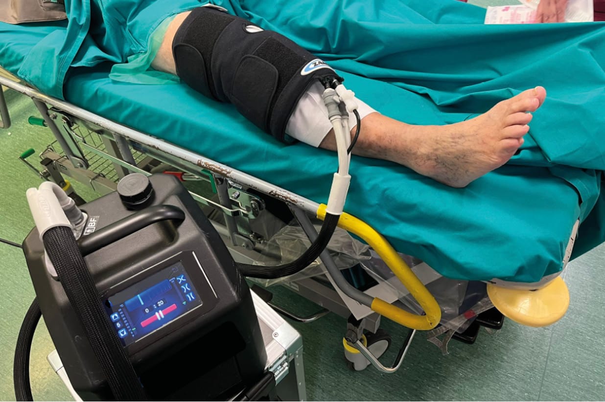 Cryotherapy (Figure 2) represents a well-known therapeutic intervention in TKA management, with solid evidence supporting its efficacy limiting vasoconstriction, inflammation, oedema, and pain transmission [14], Morsi E. Continuous-flow cold therapy after total knee arthroplasty. J Arthroplasty 2002;17:718–22. https://doi.org/10.1054/arth.2002.33562.[15] Guillot X, Tordi N, Laheurte C, Pazart L, Prati C, Saas P, et al. Local ice cryotherapy decreases synovial interleukin 6, interleukin 1β, vascular endothelial growth factor, prostaglandin-E2, and nuclear factor kappa B p65 in human knee arthritis: a controlled study. Arthritis Res Ther 2019;21:180. https://doi.org/10.1186/s13075-019-1965-0.. The addition of compression enhances cold penetration into deeper tissue layers and prevents fluid accumulation by reducing vascular-tissue pressure differentials [16] de Vries AJ, Aksakal HK, Brouwer RW. Effects of 6 weeks of cryotherapy plus compression therapy after total or unicompartmental knee arthroplasty: protocol for a single-centre, single-blind randomised controlled trial. BMJ Open 2024;14:e077614. https://doi.org/10.1136/bmjopen-2023-077614.. The physiological benefits translate into accelerated rehabilitation progress and quantifiable clinical improvements, including reduced pain intensity and decreased opioid requirements during the recovery period [17] Hohenauer E, Clarys P, Baeyens J-P, Clijsen R. The effect of local cryotherapy on subjective and objective recovery characteristics following an exhaustive jump protocol. Open Access J Sports Med 2016;7:89–97. https://doi.org/10.2147/OAJSM.S110991..