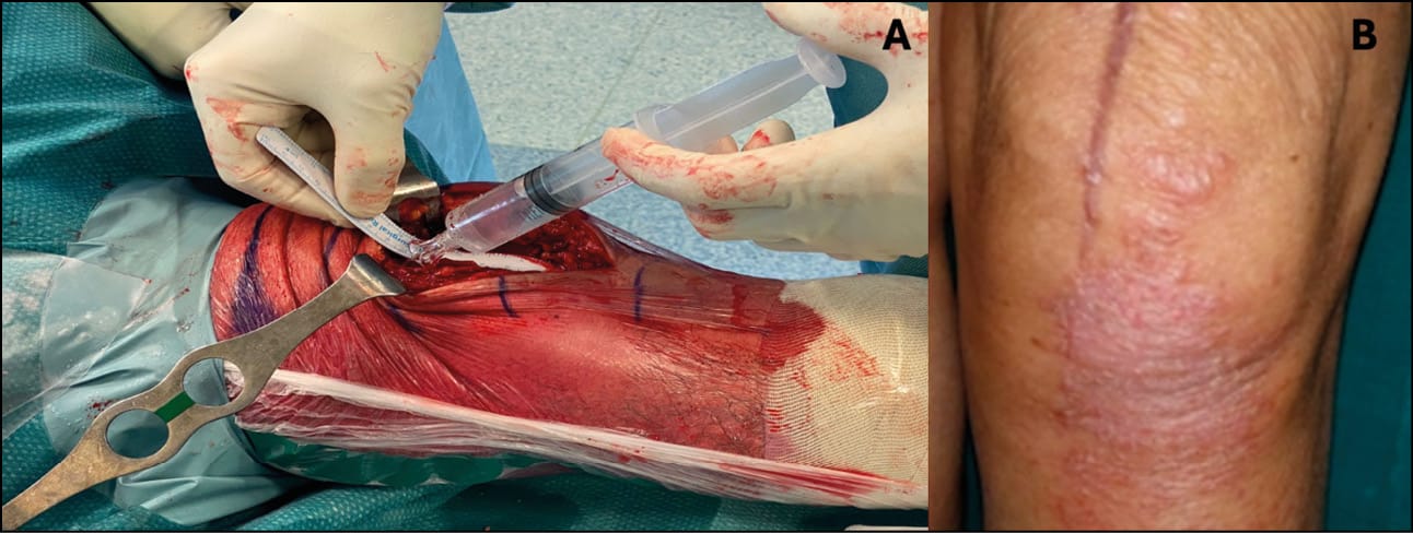 Intra-articular administration of 30-40ml tranexamic acid serves dual therapeutic purposes: achieving effective local hemostasis while providing a diagnostic method for assessing watertight capsular closure integrity, ensuring that fast recovery and rehabilitation protocols do not jeopardize wound healing [47] Elmenawi KA, Mohamed FAE, Poilvache H, Prokop LJ, Abdel MP, Bedard NA. Association Between Tranexamic Acid and Decreased Periprosthetic Joint Infection Risk in Patients Undergoing Total Hip and Knee Arthroplasty: A Systematic Review and Meta-Analysis of Over 2 Million Patients. J Arthroplasty 2024;39:2389-2394.e2. https://doi.org/10.1016/j.arth.2024.04.033.. This technique facilitates systematic layer-by-layer “running” sutures, preventing articular fluid extravasation during early mobilization compromising healing or bacteria infiltration increasing infection risk [48] Zhang Q, Chen Y, Li Y, Liu R, Rai S, Li J, et al. Enhanced recovery after surgery in patients after hip and knee arthroplasty: a systematic review and meta-analysis. Postgrad Med J 2024;100:159–73. https://doi.org/10.1093/postmj/qgad125..