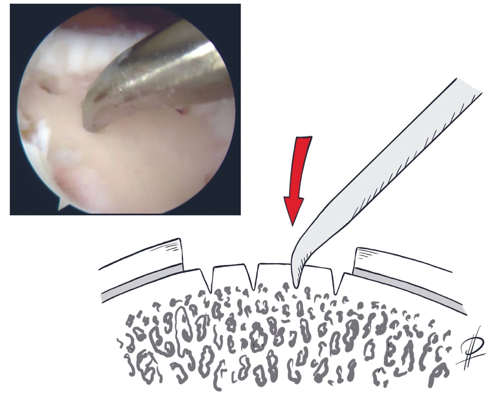 Nowadays, the microfracture procedure is the most frequent technique performed for bone marrow stimulation. The assumption is that multipotent stem cells, from bone marrow, can reach the damaged area by microfracture gap. This technique, popularized by Steadman in 1997 [Steadman], used arthroscopic awl to penetrate the subchondral bone in a controlled pattern resulting in release of blood and mesenchymal cells capable of repairing the cartilage (Figure 2).