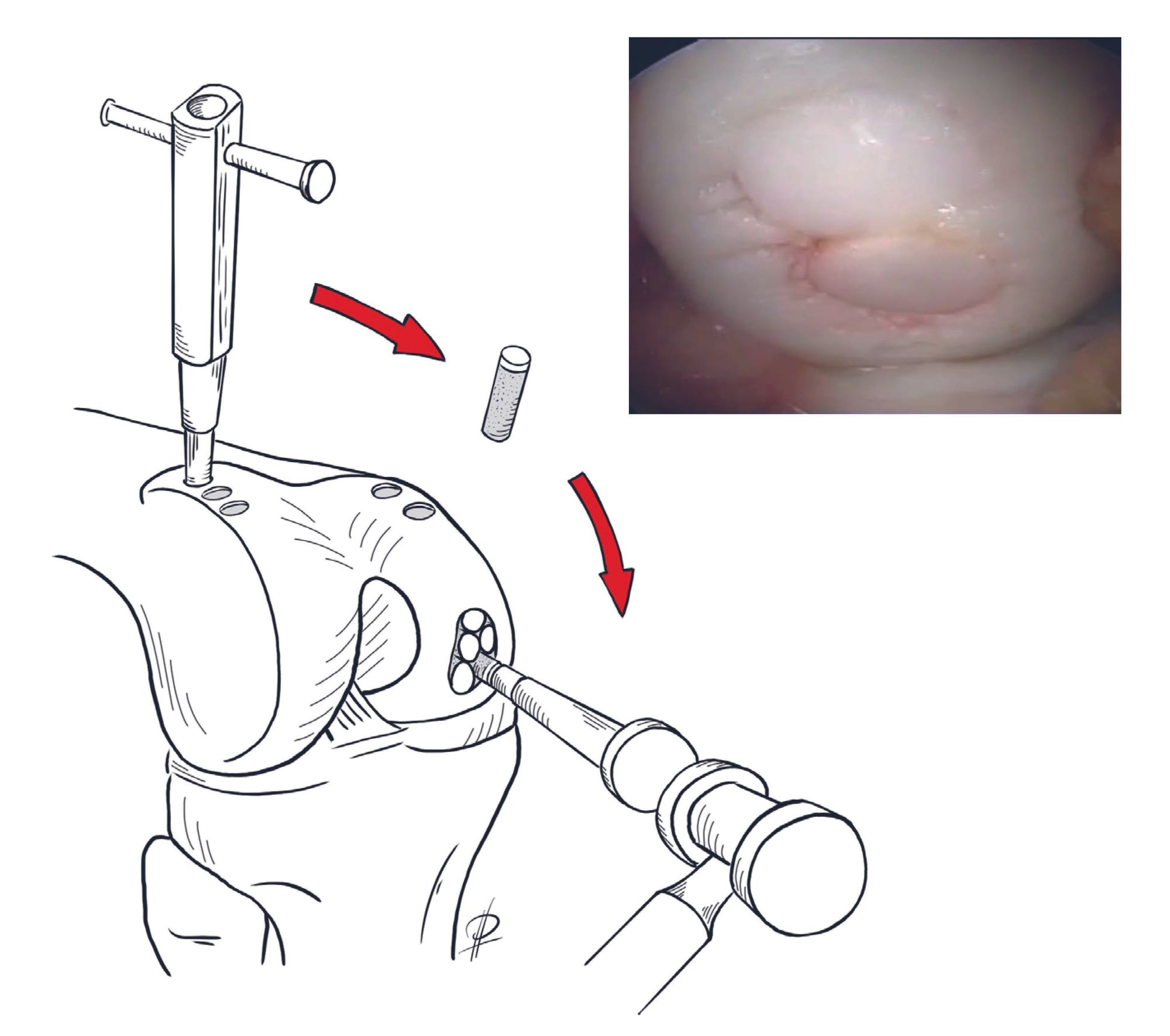 With Osteochondral Autograft Transfer (OAT), the defects are filled immediately in a one-stage procedure with osteochondral cylinders, harvested from the trochlea and intercondylar notch through perpendicular access to the cartilage surface (Figure 5). This arthroscopic, mini open technique, allows the donor’s osteochondral cylinder to be flushed in order to re-create the normal articular contour and contact pressures in the pathological area. The advantage is to immediately replace the defect by mature hyaline articular cartilage with the ostechondral unit. The main limitations are the ability to treat large lesions [Hangody 2003, Gudas].