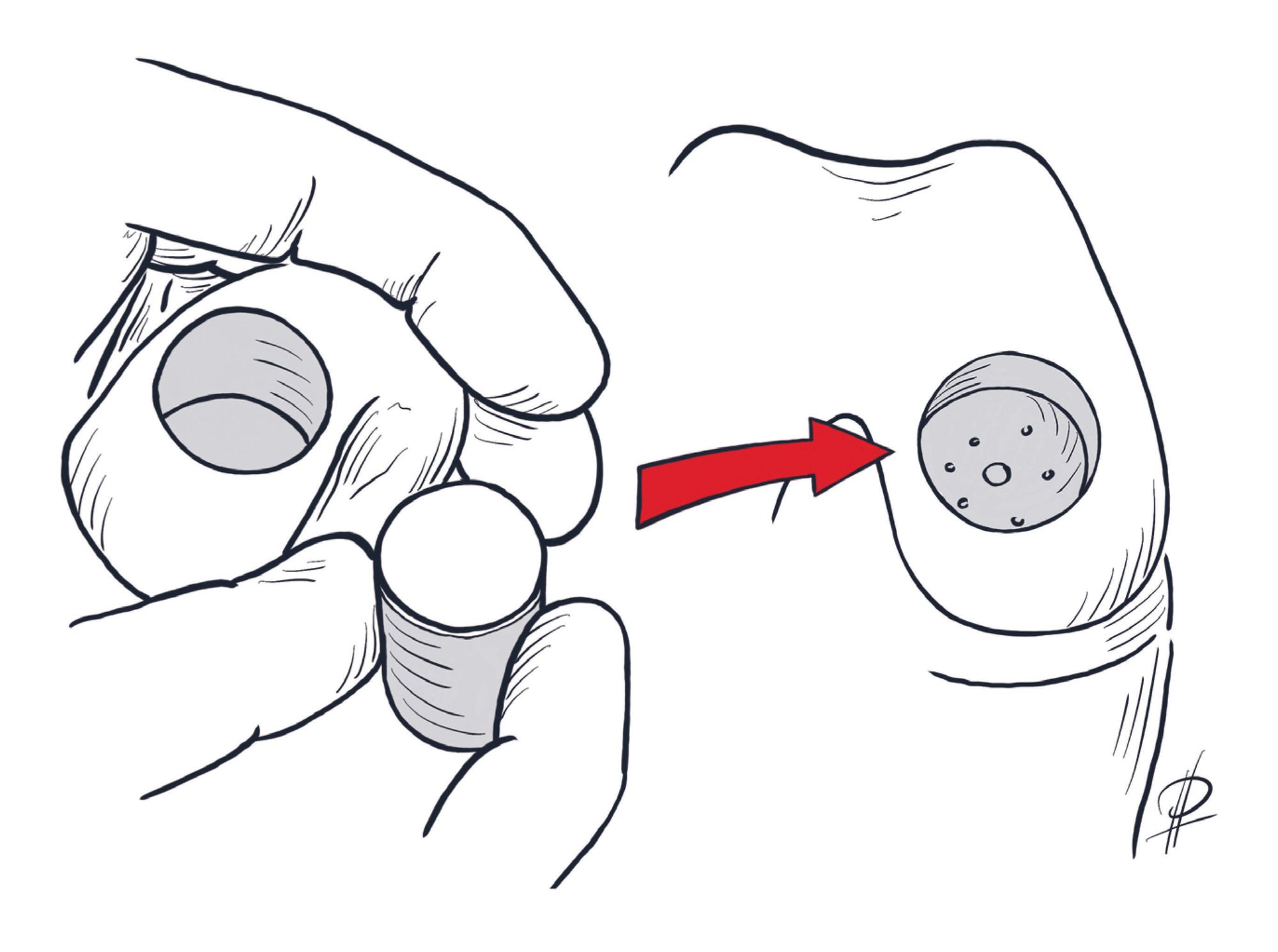 The osteochondral allograft transplantation (OCA) is a single stage technique used for large osteochondral defects. Like in osteochondral autograft, a cylinder plug is harvested but from fresh cadaver donor matching the size, shape and location of the osteochondral defect (Figure 6).