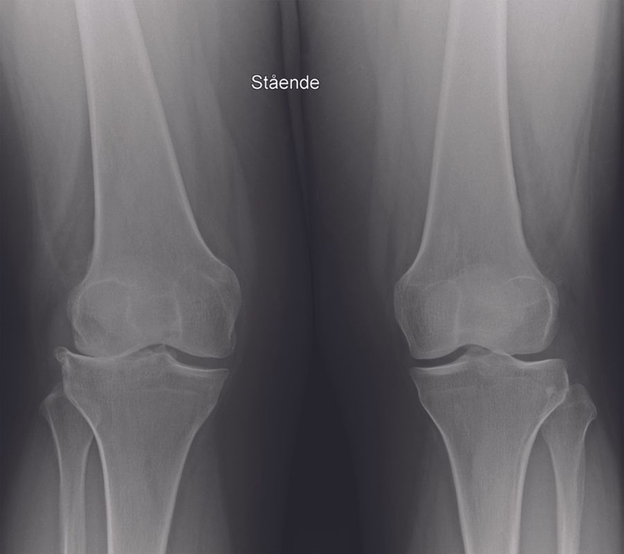 My routine radiographic examinations of patients referred with pain believed to origin from knee OA include weight-bearing AP, lateral, and skyline views. These may be supplemented by valgus and varus stress radiographs, a Rosenberg view and / or MRI of the knee as needed. It is fundamental to establish bone-on-bone OA in the lateral compartment. Due to the specific features of lateral compartment OA bone-on-bone may not present on the weight-bearing radiograph with the knee extended. If there is any doubt about the bone-on-bone diagnosis in the lateral compartment supplemental imaging should be applied. On the weight-bearing AP view it is also assessed if there is preserved cartilage in the medial compartment. If in doubt a varus-stress radiograph may be helpful to assess this, and at the same time a varus stress will show correction of valgus deformity, opening of the lateral compartment, and indirectly that the LCL is functionally intact. In the lateral radiographic view the relative position of the femur and tibia should be assessed. If the femur is very posteriorly positioned it may be a sign that the ACL is degenerative and torn. The skyline view is specifically assessed for the presence of severe bone-on –bone OA. In general I only find MRI examination necessary in younger patients, particularly if the knee hos posttraumatic OA, in which case MRI can give good information about cartilage damage and degeneration in the lateral and the remaining compartments, as well as the status of cruciate ligaments.