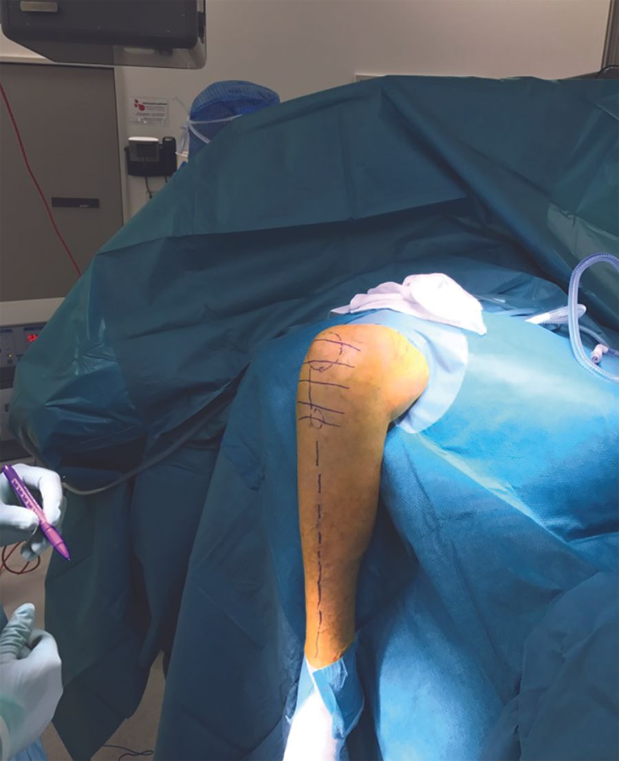 I prefer to position the leg to be operated in a leg holder / thigh support on the side of the table. The table is not otherwise modified. The hip is flexed approximately 30 degrees, leaving the knee flexed about 120 degrees, which allows for proper preparation of the femoral condyle. I stand up while performing the operation. I find it needed to apply a tourniquet (never at more than 250 mmHg) as bleeding will otherwise be “trapped” in the surgical field and reduce visibility significantly. Unlike TKA surgery, the blood can’t easily escape.
