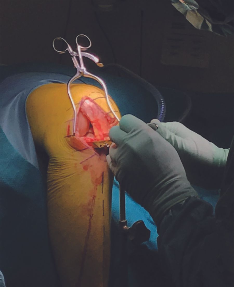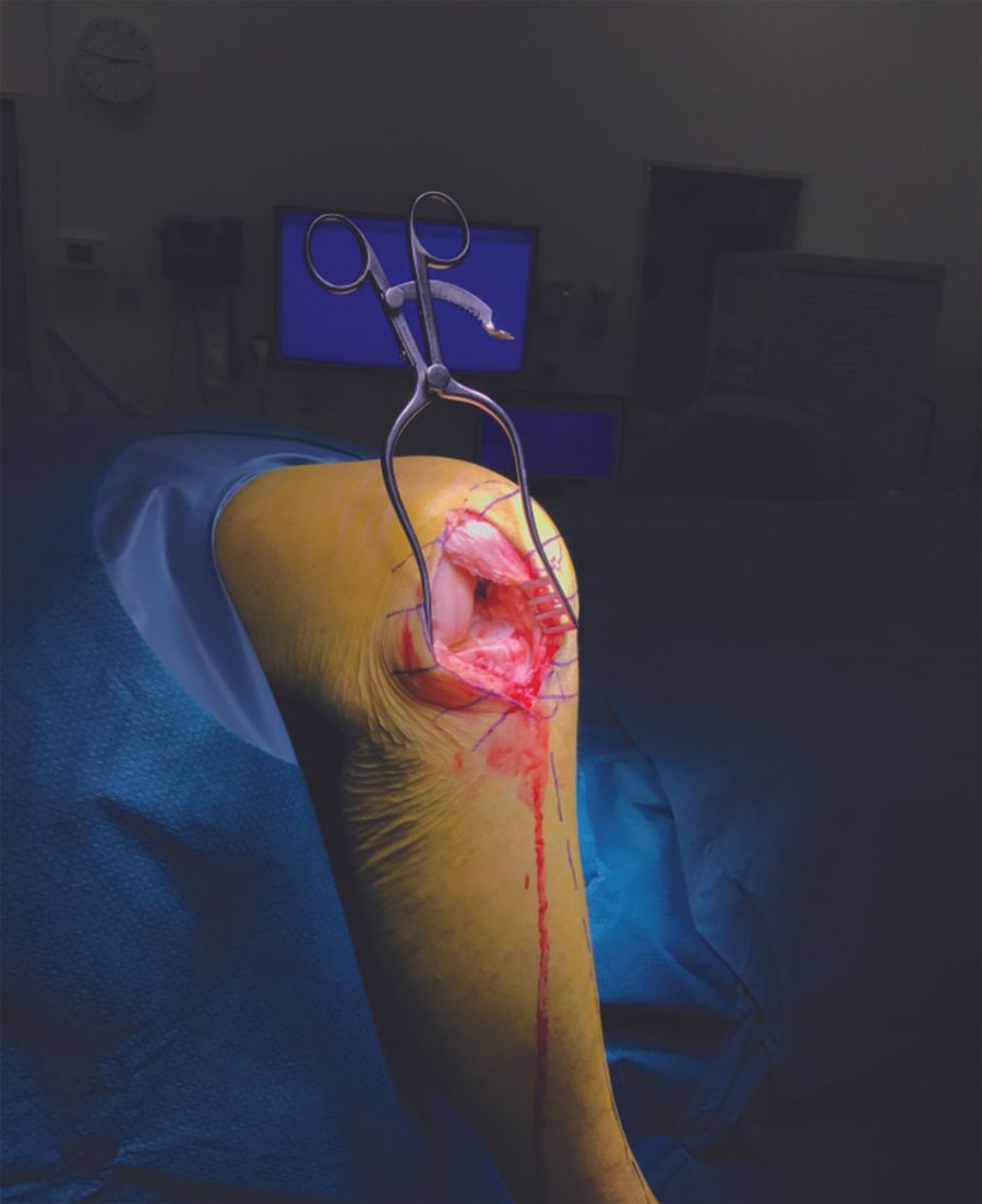 The joint is then inspected to secure that the indications to perform LUKA is still fulfilled. Osteophytes are removed from the lateral margin of the lateral condyle and from both sides of the intercondylar notch around the ACL. Any osteophytes anterior to the ACL footprint anterior on the tibia are removed. Any postero medial osteophytes on the lateral condyle are removed to ensure smooth and unforced introduction of the saw blade for the sagittal tibia cut. The front of the tibia is exposed between tibial tuberosity and to Gerdy’s tubercle and the visible part of the lateral meniscus is excised.