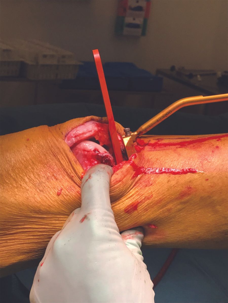 2) extend the proximal incision and break down any intraarticular, supra-patellar adhesive strings;