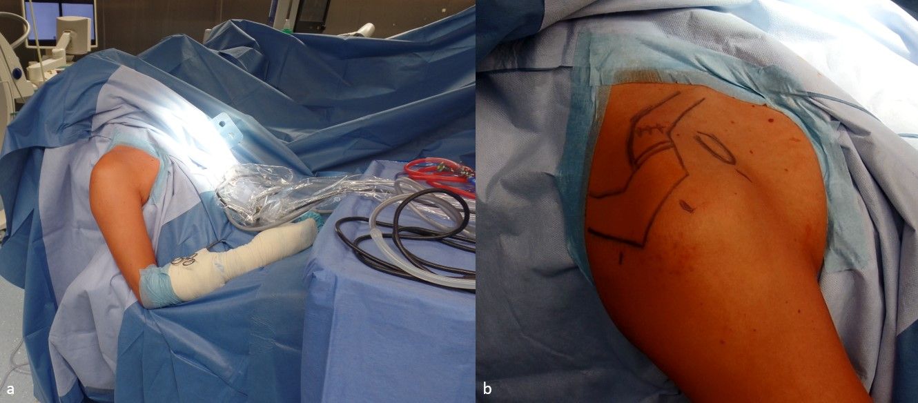 The patient is placed in the beach-chair position with the arm prepped and draped in a sterile fashion (Fig. 2a). The patient’s head should slightly be tilted to the contralateral side allowing enough space for drilling of the coracoclavicular tunnel. For this minimal invasive surgical technique, a posterior and lateral viewing portal and an anteroinferior working portal are necessary. Additionally, a 2-3 cm incision on top of the clavicle is required (Fig. 2b).
