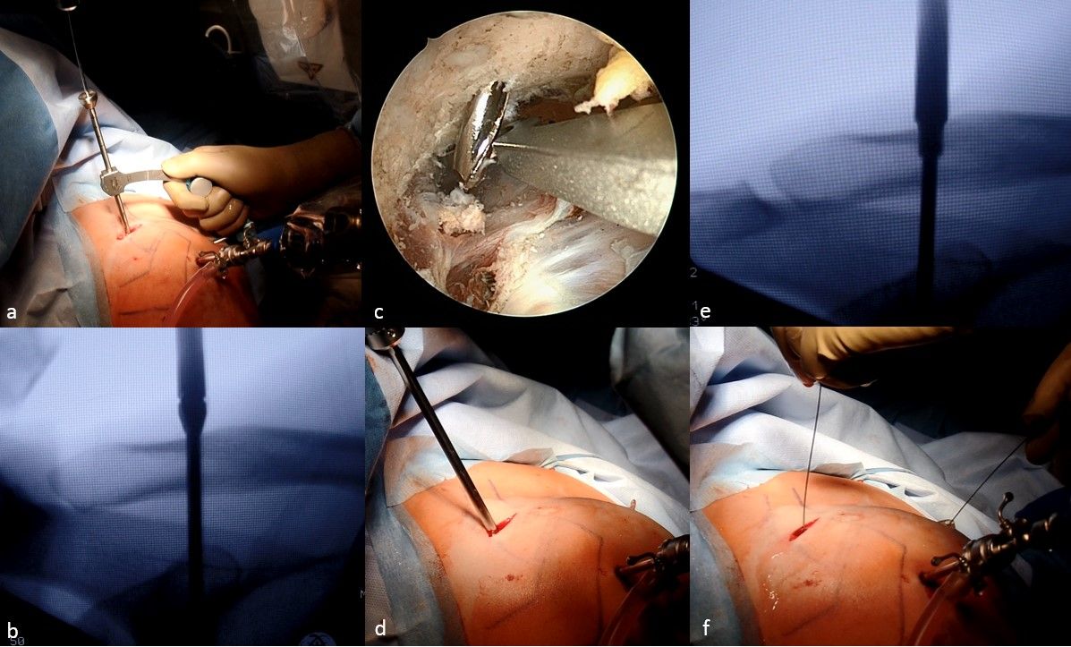 Subsequently the drill is unicortical overdrilled using a 5.1 mm drill bit (Fig 3d & e). The K-wire is then removed and a nitinol suture passing wire is inserted via the cannulated drill bit into the subcoracoid space and retrieved via the anteroinferior portal (Fig. 3f). The cannulated drill bit can then be removed.