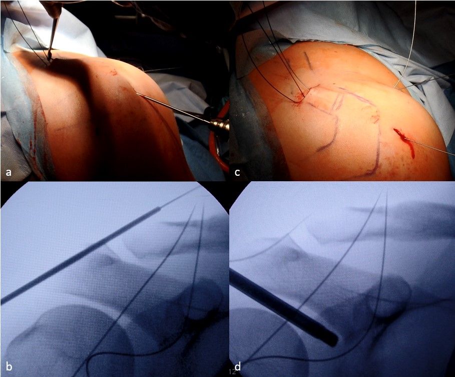 An image intensifier is used for the correct placement of the drill holes and the anatomical reduction of the AC joint. For coracoclavicular drilling an adjustable drill guide is used and the marking hook is introduced through the anteroinferior portal under direct visualization and placed under the central part of the coracoid base. The other end with the drill sleeve, is placed about 3cm medial from the lateral end of the clavicle. The drill hole is established in between the previous coracoclavicular ligaments in a transclavicular-transcoracoidal fashion. With the drill guide held in this position and under arthroscopic control, a 3mm drilling through the clavicle and the base of the coracoid is performed using a drill bit with an implemented K-wire (Fig 3a). Alternatively, a 2 mm K-wire can be used that is overdrilled using a 3.5 mm drill. The correct placement of the coracoclavicular drilling is controlled using the image-intensifier (Fig 3b & c).