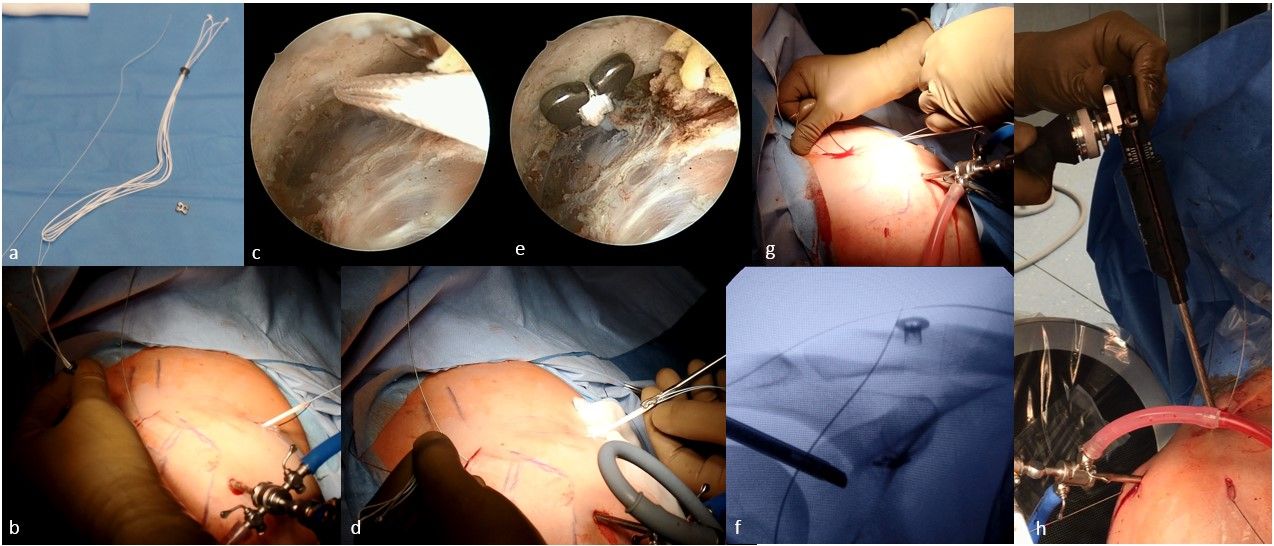 The inferior sutures of the low-profile Tightrope device (Arthrex, Naples, Florida) are attached to the proximal eyelet of the first nitinol wire and pulled from the other end through the clavicle and coracoid (Fig. 6a). Under arthroscopic control, the sutures are retrieved via the anteroinferior portal (Fig 6b & c). A DogBone button (Arthrex, Naples, Florida) is attached to the inferior sutures (Fig 6d). By using a clamp and by pulling from superior, the inferior button is placed under the coracoid arch. Under arthroscopic control, the button is placed in the correct position (Fig. 6e). By pulling the sutures of the low-profile device alternating the double button system tightens itself. The two suture pairs are pulled alternating until the superior button is on the level of the clavicle enabling an anatomical reduction of the AC-joint (Fig. 6f & g). A suture tensioner is mandatory for a proper tensioning of the Tightrope device. 80-100 N are applied for each suture which can lead to some overreduction of the AC-joint that is accepted (Fig. 6h). The anatomical reduction of the AC-joint should be controlled using the image-intensifier. Once reduction is achieved, the sutures are knotted securely. Before cutting the sutures on a low profile, to reduce knot stack, we recommend knotting the sutures of the device to provide sufficient stability and avoid early redislocations.