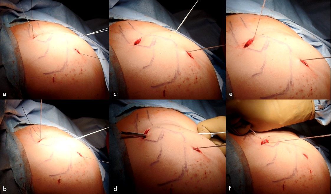 For horizontal stabilization, a triangular acromioclavicular cerclage with a non-absorbable tape is used. First the tape is attached to the clavicular nitinol suture passer and pulled from the other end (Fig. 7a & b). Then the tape is attached to the eyelet of the acromial nitinol passing wire and pulled through the lateral portal (Fig. 7c). The back part of the tape at the anteroinferior portal is attached to a knot pusher device and retrieved via the clavicular incision (Fig 7d). The tape from the lateral portal is also attached to the knot pusher and retrieved subcutaneously to the clavicular incision (Fig. 7e). This step avoids soft tissue interposition. The ends of the non-absorbable tape can now be tightened and knotted (Fig. 7f).