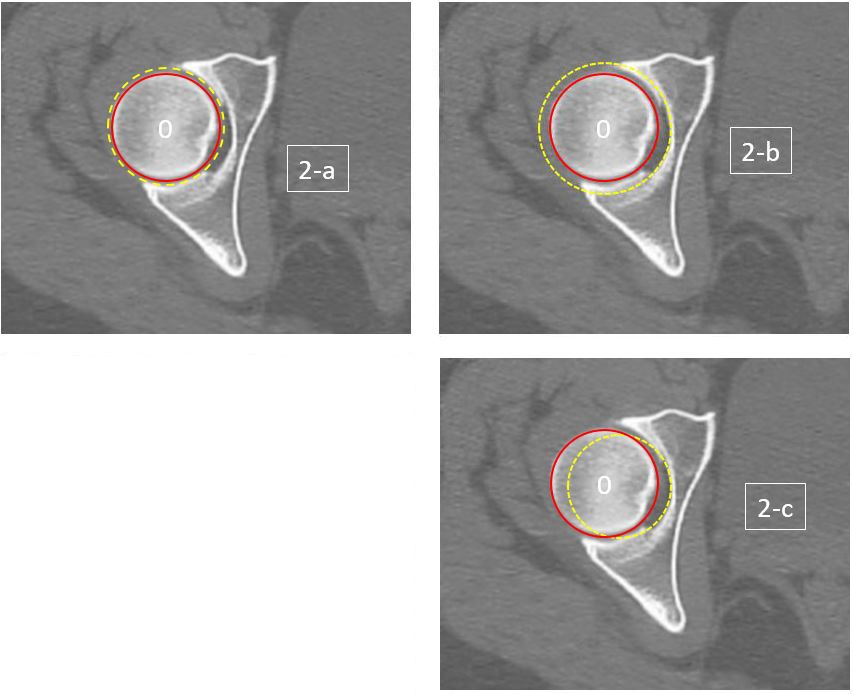 Only the peripheral part of the acetabulum is articular; the more medial fossa should not be included in the hip’s centre of rotation [11]. Its positioning is not affected by hip dysplasia or by primary arthritis.