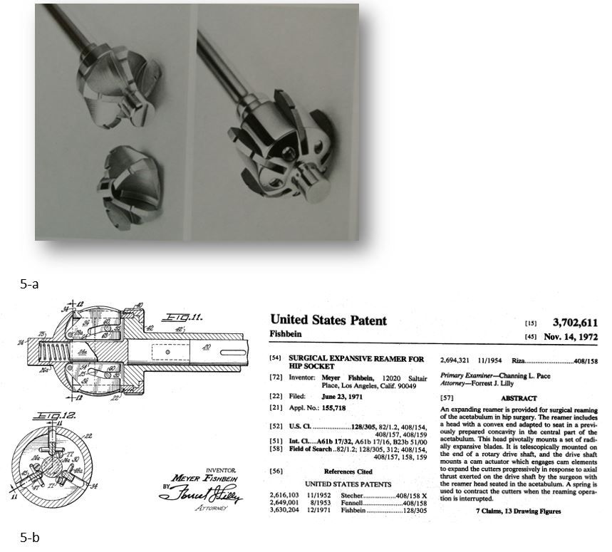 Mechanical reamers were first used to prepare a joint socket during a THR reported by Charnley in 1972 [26]. A hole created in the middle of the acetabulum enabled the reamer to be centred throughout the process of preparing the socket (Fig. 4). Three radially expanding cutting blades permitted gradual abrasion of the cartilage and subchondral bone, while retaining the reaming device in its original position around the hip’s centre of rotation (Fig. 5).